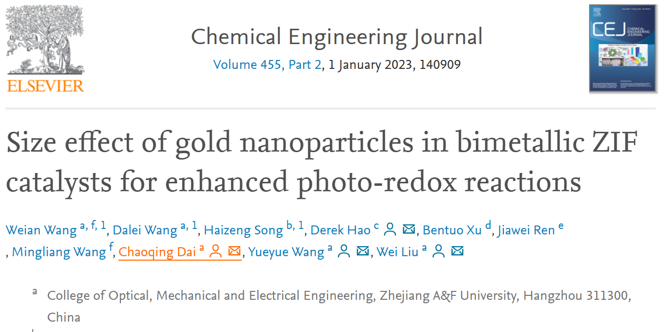 先进光电子应用基础交叉研究中心戴朝卿教授团队以“Size effect of gold nanoparticles in bimetallic ZIF catalysts for enhanced photo-redox reactions”为题于12月12日发表在工程技术领域国际期刊《Chemical Engineering Journal》上(中科院1区,IF=16.744)。这是先进光电子应用基础交叉研究中心筹建以来,将光谱检测应用于农林环境领域,实现工农交叉的重要成果。本文第一单位为浙江农林大学光机电工程学院,通信作者为德国马普所洪堡学者郝强博士,浙江农林大学戴朝卿教授、王悦悦教授、刘威副教授。