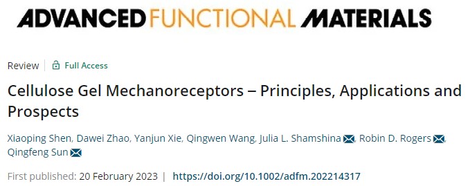 2023年2月20日,林业工程学科生物质仿生智能研究团队青年教师教师沈晓萍以第一作者在材料科学领域国际期刊《Advanced Functional Materials》(中科院1区Top,IF=19.924)在线发表题为“Cellulose gel mechanoreceptors - principles, applications and prospects”(木质纤维素凝胶基智能机械感受材料-原理、应用及展望)的综述论文。通讯作者为美国得克萨斯理工大学Julia L. Shamshina助理教授、美国阿拉巴马大学Robin D. Rogers教授和浙江农林大学孙庆丰教授。浙江农林大学化学与材料工程学院为该论文第一单位和通讯作者单位。