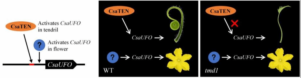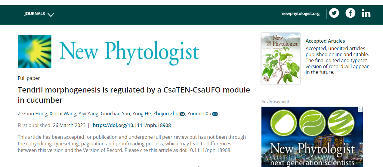 近日,园艺科学学院朱祝军教授团队(设施园艺与品质调控团队)在《New Phytologist》(中科院1区,IF=10.323)发表题为“Tendril morphogenesis is regulated by a CsaTEN-CsaUFO module in cucumber”的研究论文。研究结果揭示了葫芦科植物卷须变态发育一个可能的保守基因通路TEN-UFO,促进了对植物攀爬行为进化的理解,可为葫芦科园艺作物(如黄瓜、西瓜、南瓜等)的“无卷须”育种和轻简化栽培提供依据。