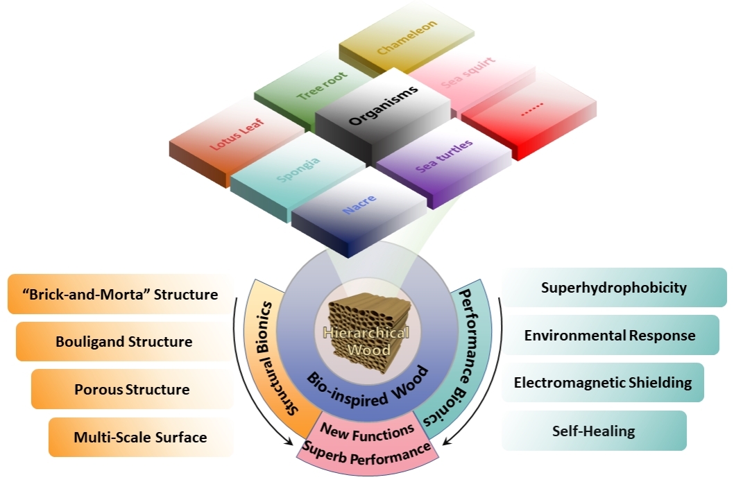该综述论文全面总结阐释了近期在生物仿生木材制品领域的研究进展,通过融合纳米技术、分子生物学、界面化学以及物理建模等先进技术,模仿并构筑具有独特功能的自然生物结构。从生物仿生的视角出发,深入解构自然现象和生物结构,探究组成和结构设计原理、构效机制和重构策略,建立木基生物仿生功能/智能材料的理论和技术基础。通过借鉴自然界和木材中固有智能行为和独特结构的启示,探讨了用于加工仿生木材复合材料的技术手段,旨在实现木材的自增值(如超疏水木材、分级结构木材、磁性木材)、自修复、自学习(如气凝胶型木材)以及环境适应性(如热响应、光响应、pH响应木材等)。木材仿生智能科学为多种木材加工技术提供了全新的理念、设计方法和组合途径,通过化学处理、物理加工以及生物加工,赋予木材全新的功能和智能响应能力。