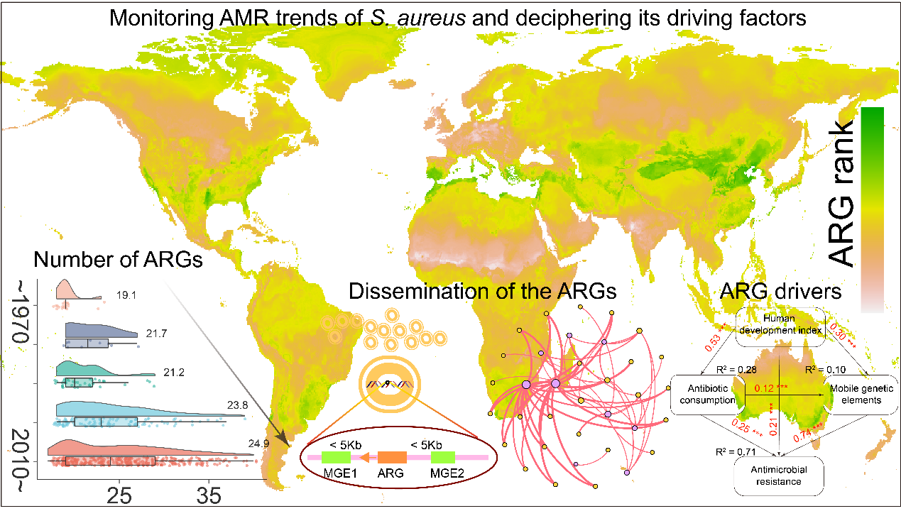 该论文探究了100多年来全球食源性致病菌—金黄色葡萄球菌(Staphylococcus aureus)耐药基因的进化的驱动因素及传播机制。浙江农林大学食品与健康学院方冠宇老师为论文的第一作者和通讯作者,刘兴泉教授为文章的通讯作者。