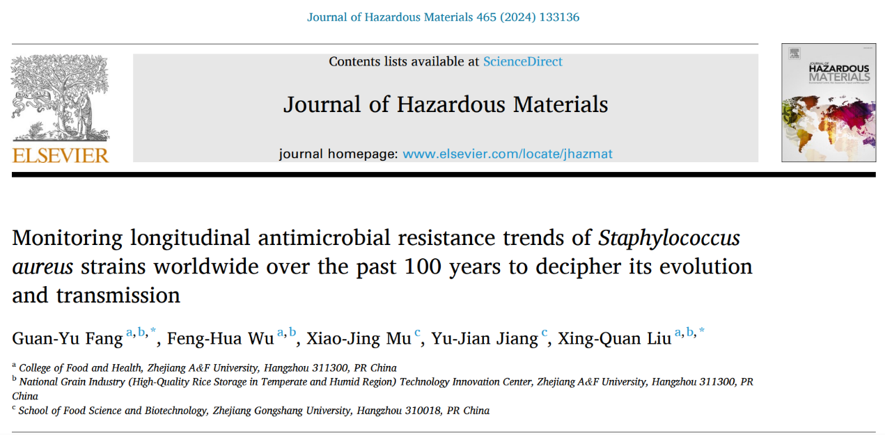 近日,食品与健康学院刘兴泉教授团队在国际期刊Journal of Hazardous Materials(中科院一区Top,IF:13.6)在线发表了题为Monitoring longitudinal antimicrobial resistance trends ofStaphylococcus aureusstrains worldwide over the past 100 years to decipher its evolution and transmission的研究性论文。