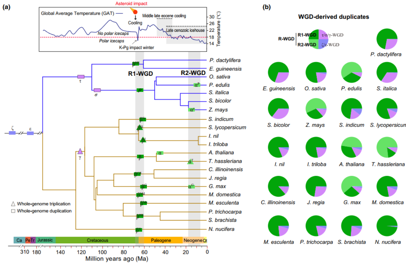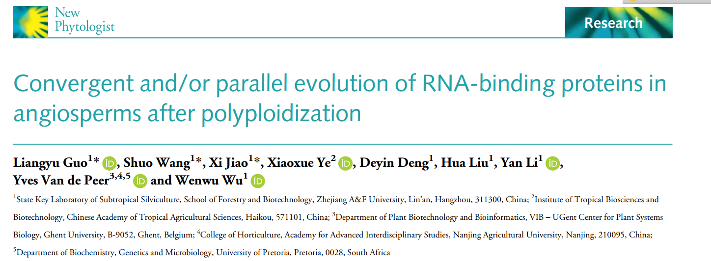 近日,浙江农林大学国家重点实验室李彦、吴文武教授与比利时根特大学Yves Van de Peer院士联合在《New Phytologist》(中国科学院1区Top,IF5-yr=10.5)上发表了题为“Convergent and/or parallel evolution of RNA-binding proteins in angiosperms after polyploidization”(被子植物多倍化后RNA结合蛋白的趋同或平行进化)的研究论文。该研究主要基于拟南芥、毛果杨、苹果、番茄、大豆、山核桃、水稻、玉米、毛竹、棕榈等21个代表性被子植物,结合基因组学、转录组学、调控组学以及古气候学研究数据,揭示了在WGD后被子植物RBP基因趋同进化以适应K-Pg和晚新生代冰期的全球大降温。