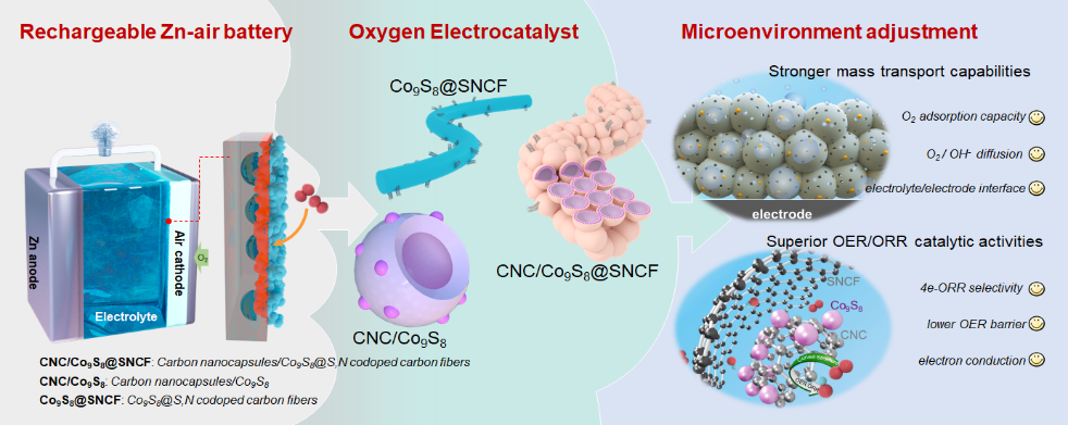 近日,化材学院胡勇教授与颜磊博士等人在国际顶级期刊《Applied Catalysis B: Environment and Energy》(中科院1区TOP,IF=22.1)发表题为《调控基于碳胶囊与Co9S8纳米颗粒组成的S,N共掺杂碳纤维氧电催化剂的界面微环境用于高效锌空电池》“Customizing oxygen electrocatalytic microenvironment with S, N codoped carbon nanofibers confining carbon nanocapsules and Co9S8nanoparticles for rechargeable Zn-air batteries”的研究论文。