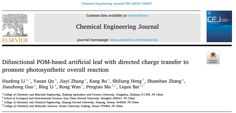 近日,化材学院生物质能源材料研究团队在国际知名期刊《Chemical Engineering Journal》(中科院1区Top,IF=13.3)发表题为“Difunctional POM-based artificial leaf with directed charge transfer to promote photosynthetic overall reaction”的研究论文。浙江农林大学为第一通讯单位,化材学院青年教师李华丰博士、白丽群教授和河南大学马鹏涛教授为通讯作者。