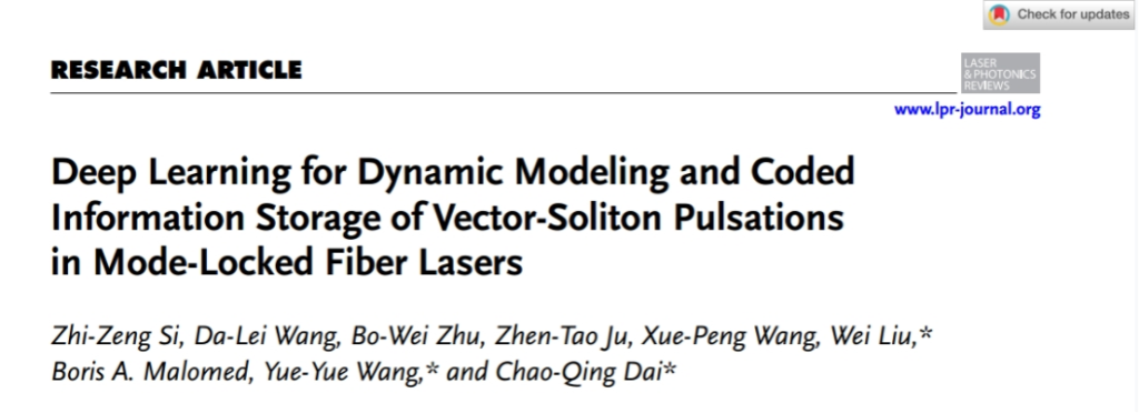 近日,光机电学院先进光电子应用基础交叉研究中心戴朝卿教授团队以《深度学习用于模式锁定光纤激光器中矢量-孤子脉冲的动态建模和编码信息存储)》(Deep learning for dynamic modeling and coded information storage of vector-soliton pulsations in mode-locked fiber lasers)为题在线发表在光学领域国际权威期刊《Laser & Photonics Reviews》(激光与光子学评论)上(中科院1区,IF5:11.1)。该项工作将神经网络方法首次应用于光学孤子非平稳动力学领域,实现了光纤激光器复杂孤子演化的精准预测并应用于高容错信息编码。该论文成果的第一单位为浙江农林大学光机电工程学院,第一作者为硕士研究生司志增,论文共同第一作者为王大磊副教授,论文通讯作者为光机电工程学院戴朝卿教授,共同通讯作者为刘威副教授、王悦悦教授。