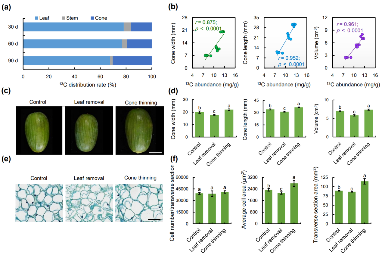与被子植物不同,香榧等裸子植物具有复杂而原始的繁殖结构—球果(cone),且具有较长的发育周期。受精后,球果或者进入休眠状态或者迅速膨大,这一膨大过程对裸子植物种子生产、繁殖和产量形成至关重要。然而,关于受精后球果膨大机制一直是未解之谜。