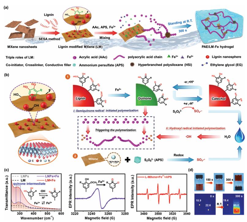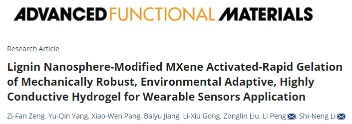 近日,化材学院林业工程学科生物基软材料与阻燃功能材料团队以“Lignin Nanosphere-Modified MXene Activated-Rapid Gelation of Mechanically Robust, Environmental Adaptive, Highly Conductive Hydrogel for Wearable Sensors Application”(《基于木质素纳米球修饰MXene的力学强韧、环境自适应、高导电水凝胶的快速凝胶化及其可穿戴传感器应用》)为题发表在工程技术领域国际期刊《Advanced Functional Materials》上(中科院1区TOP,IF=18.5)。论文第一作者为团队硕士毕业生曾子凡,青年教师厉世能博士为论文通讯作者,合作通讯作者为中科院物理所/长三角物理研究中心的彭蠡副研究员。浙江农林大学化学与材料工程学院为该论文第一单位和通讯作者单位。