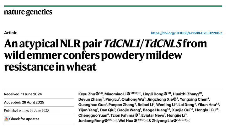 6月9日,现代农学院戎均康教授与中国科学院遗传与发育生物学研究所刘志勇研究员领衔的植物免疫团队合作在《Nature Genetics》(IF=31.8)以长文形式发表题为《An atypical NLR pairTdCNL1/TdCNL5from wild emmer confers powdery mildew resistance in wheat》(《野生二粒小麦非典型NLR基因(TdCNL1/TdCNL5)协同调控小麦白粉病抗性》)的研究论文。