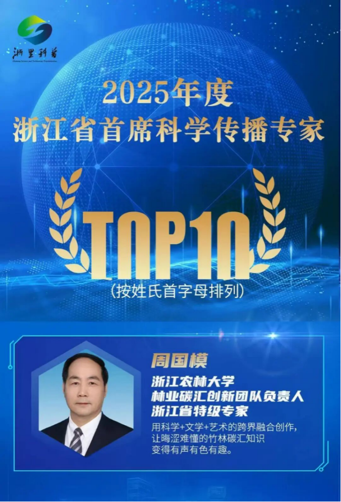 近日,全国科普月浙江主场活动在杭州举办。会上,备受关注的2025 年度浙江省“十百千万”科学传播“TOP10”评选结果正式揭晓,我校环境与资源学院周国模教授,入选2025年度浙江省首席科学传播专家TOP10。