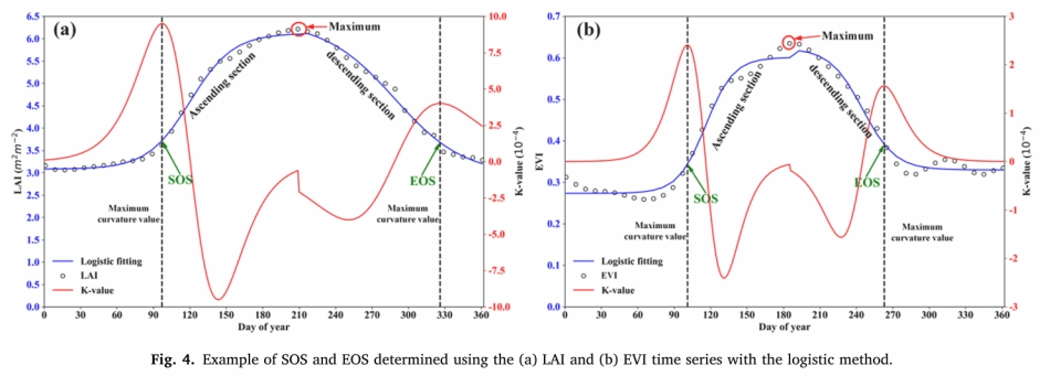 本研究创新构建基于LAI同化的竹林物候遥感反演模型系统,实现了竹林物候(SOS、EOS)时空分布高精度反演。该模型系统首先构建LAI同化系统,获得高精度MODIS LAI时间序列同化产品;然后,利用每年LAI最大值将竹林生长过程分为生长阶段和下降阶段;最后,采用logistic回归方程对两个阶段分别进行拟合并计算拟合方程的曲率,以两个阶段最大曲率对应的日数作为SOS和EOS。