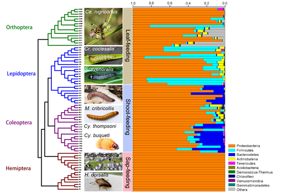 近日,我校林业与生物技术学院森林昆虫团队在国际知名刊物《Frontiers in Microbiology》(IF=4.235),在线发表了最新研究成果“Host phylogeny and diet shape gut microbial communities within bamboo-feeding insects”。该研究证实了亚热带食竹昆虫的系统发育和食性主导了其肠道微生物群落结构,而以纤维素降解菌为代表的功能菌群主要由昆虫的系统发育驱动,这些结果为研究非同源物种的食性趋同进化奠定了基础。