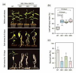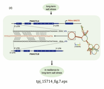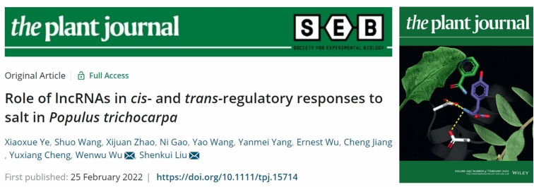 近日,国家重点实验室林木分子改良研究团队(柳参奎教授团队)在《The Plant Journal》(中科院1区,IF=6.417)发表题为“Role of lncRNAs in cis- and trans-regulatory responses to salt inPopulus trichocarpa”的研究论文。研究结果揭示了杨树中lncRNA顺式和反式调节基因表达,发现了一个在盐胁迫后期,剧烈上调表达的Ptlinc-NAC72,对其功能做了初步研究,该基因可能对植物在盐胁迫后,恢复生长方面,具有潜在的应用价值。