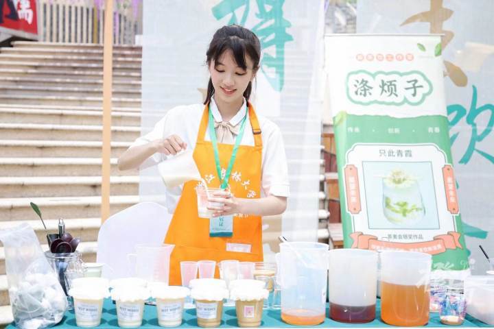 茶学院为该活动推荐了“涤烦子”新茶饮工作室携“只此青霞”奶茶惊艳亮相非遗茶市集。“涤烦子·新茶饮工作室”是浙江农林大学茶学与茶文化学院的校生态文化创意工作室,于2022年8月12日成立。工作室以传统名优茶为原料,创制新颖独特的茶饮作品,为茶消费者带来全新的品味体验。作品“只此青霞(虾)”融合杭州名菜“龙井虾仁”的元素,将传统名优绿茶和咸味海鲜成功融合,茶、虾、奶滋味相互交错,口感丰富多彩。新茶饮作品受到活动现场相关领导、同行单位及观众的热捧,并接受多家媒体的采访。其中“都市快报橙柿互动”的报道被《人民日报》新媒体平台“人民号”发布,产生了广泛影响。