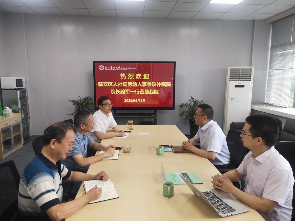 6月8日,临安区人社局劳动人事争议仲裁院院长路军、副院长郝成群到文法学院交流,对接院地合作相关事宜。文法学院院长鲁可荣、党委书记朱红东等班子成员参加座谈。