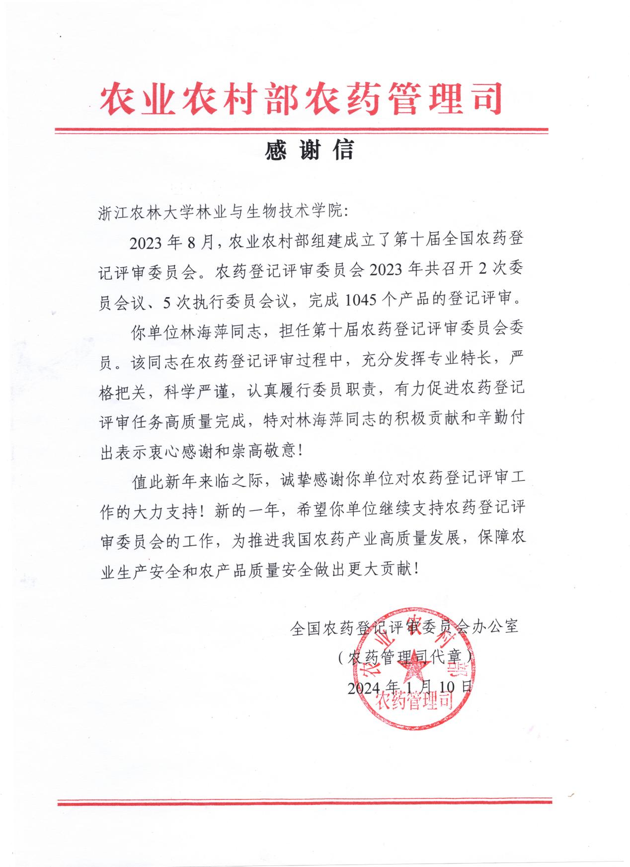 近日,林生院收到农业农村部农药管理司发来的感谢信,对于林生院林海萍教授在担任第十届农药登记评审委员会委员期间,对国家农药登记评审工作的大力支持表示诚挚的感谢。