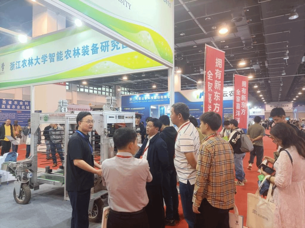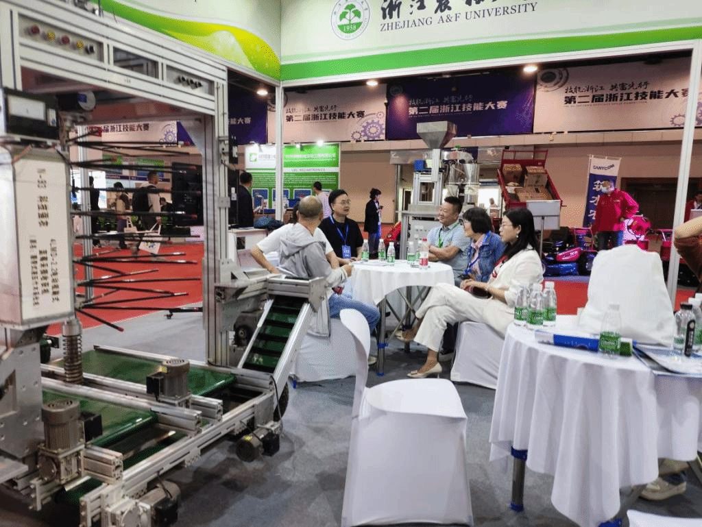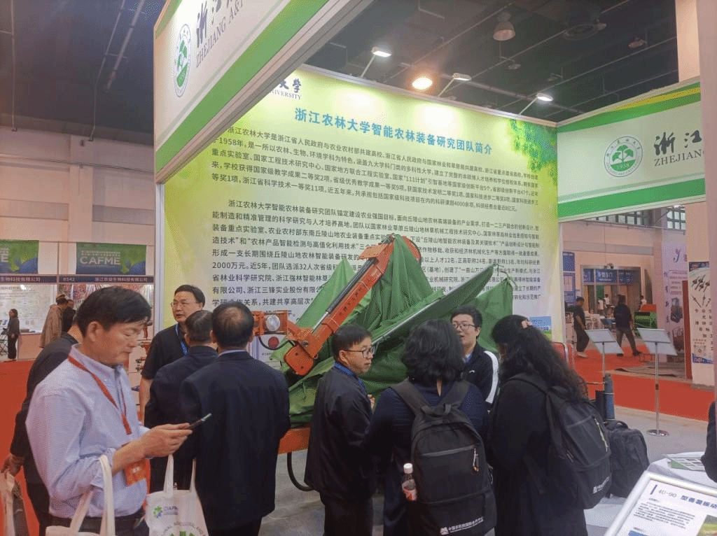 展会期间浙江省科协党组成员、副主席武传宇教授、浙江省农业机械学会理事长杨震宇总经理、浙江理工大学俞高红教授、石河子大学坎杂教授、青岛农业大学尚书旗教授、山东理工大学耿端阳教授及Dares kittiyopas(泰国农业工程学会主席)等专家学者饶有兴致地来到我校展台与参展师生深入交流,充分肯定了我校经济林全程机械化、坚果/浆果机械化采收、农机电动化无人化等农林机装备研发的技术水平及成效,参展农机也得到了农机合作社、新型农业经营主体、农机推广部门及消费者的高度关注与好评。