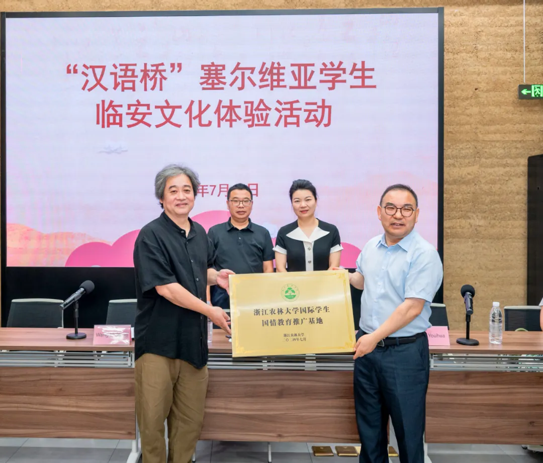 国教学院院长赵有华对临安区文联推动中塞文化交流所作出的努力表示感谢,并提出今后将充分发挥国际生的独特作用,更好地把吴越文化和临安向世界各地进行推介。赵有华给临安美术馆授予“浙江农林大学国际学生国情教育推广基地”的牌匾。