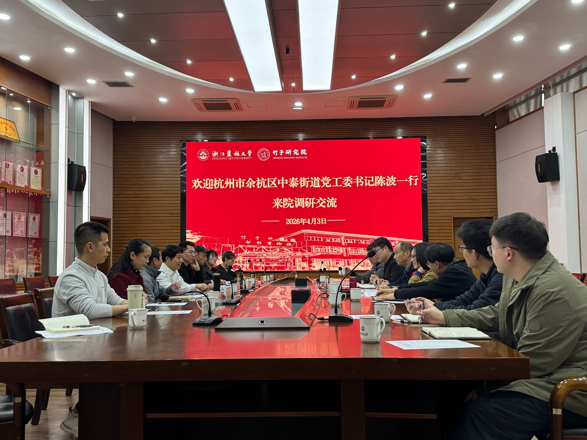 4月3日,杭州市余杭区中泰街道党工委书记陈波一行来竹子研究院调研交流。竹子研究院名誉院长方伟教授参加交流,交流会由竹子研究院党总支书记周能寿主持。