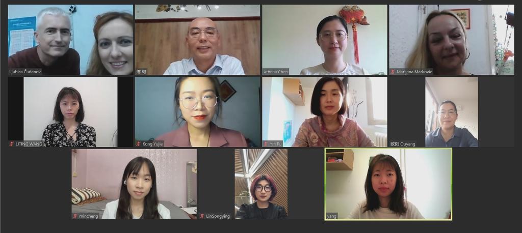 当地时间10月5日, 塞尔维亚卡尔洛夫茨语言高中(Karlovci Grammar School)校长布兰科·斯托伊科夫(Branko Stojkov)与我校合作共建的诺维萨德大学孔子学院中方院长陈晦及汉语教师举行视频会议,讨论和安排新学期孔子课堂的教学工作。本土教师丽碧彩·库达诺娃(Ljubica Cudanov)和玛丽安娜·马科维奇(Marijana Markovic)参加会谈。