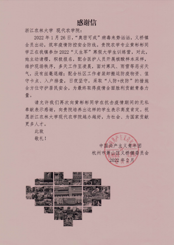 近日,我校收到杭州市萧山区义桥镇团委发来的感谢信,高度赞扬我校现代农学院农学专业黄彬彬同学在寒假期间为义桥镇疫情防控工作做出的积极贡献。