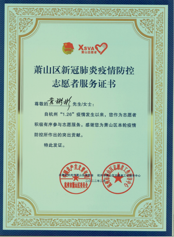 1月26日,萧山区义桥镇御景蓝湾小区因疫情实行了封闭管理,作为一名党员,黄彬彬得知消息后第一时间加入了志愿服务队,不畏艰辛奋战防疫一线,尽心尽力服务居民需求,充分发挥了党员的先锋模范作用,展示了浙农林大学子良好的精神风貌,彰显了当代青年大学生的使命担当。她也因此获得了由萧山区团委、志愿者指导工作中心颁发的“萧山区新冠肺炎疫情防控志愿者服务证书”。