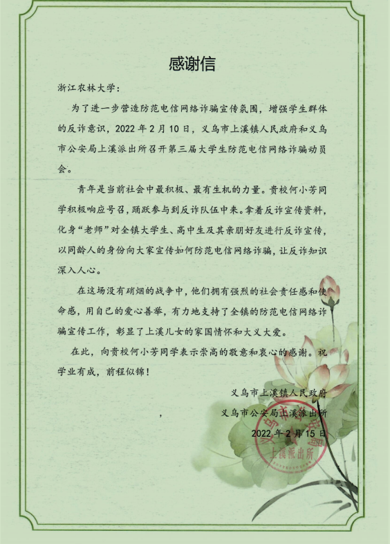 近日,我校收到来自义乌市上溪镇人民政府的感谢信,信中对我校现代农学院植物保护182班何小芳同学在义乌市防范电信网络诈骗宣传中的积极表现给予了高度评价。